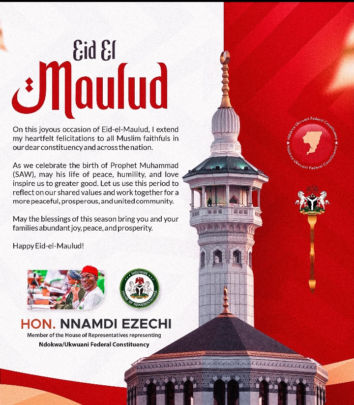The Member representing Ndokwa/Ukwuani Federal Constituency in the House of Representatives, Hon. Nnamdi Ezechi, has extended warm felicitations to Muslim faithful in his constituency and across Nigeria on the occasion of Eid-ul-Mawlid, commemorating the birth of the Holy Prophet Muhammad (SAW).