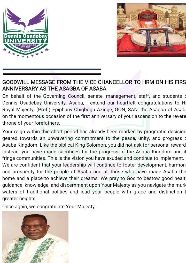 Lifestyle Goodwill Message From the VC, Dennis Osadebay University to HRM, Asagba of Asaba on His 1st Coronation Anniversary By Frederick Odu - October 5, 2025 8 views Share this news to: